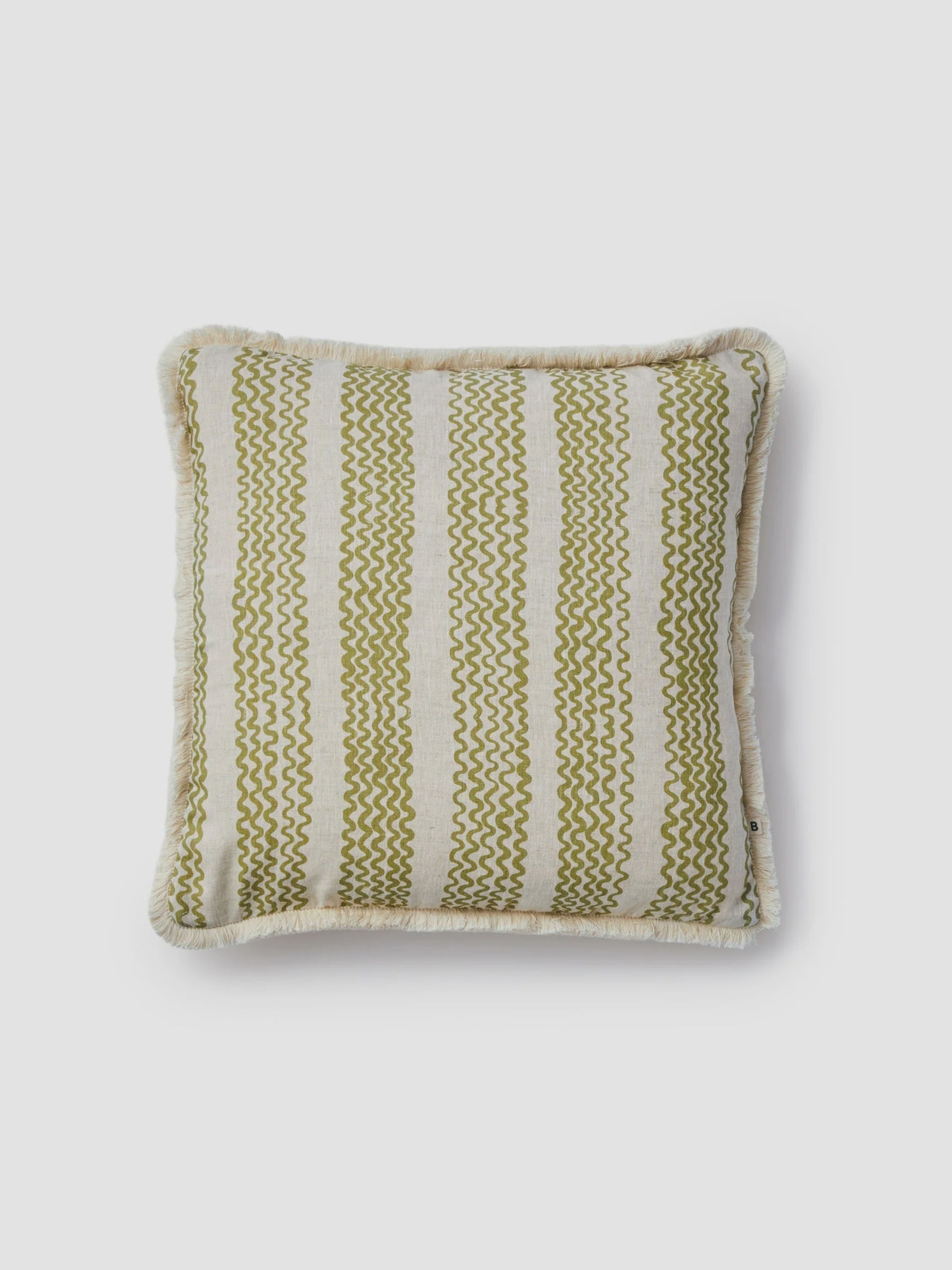 This olive linen cushion features hand-drawn stripes inspired by coastal rhythms. With its earthy green tone and soft movement, it pairs effortlessly with florals, patterns, or solids.